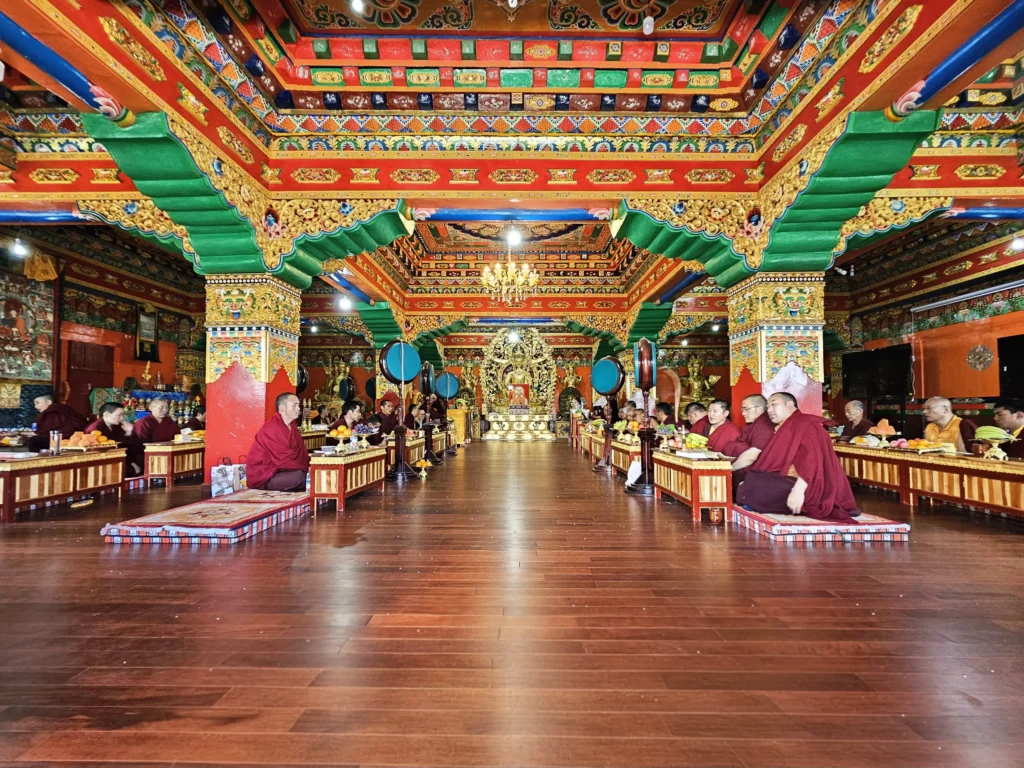 In 1999, after years of tireless effort and the generous support of his devoted disciples, Gyaltsen Rinpoche was able to acquire a modest parcel of land upon the summit of Dhonggar Mountain. This marked the foundational step in what would become the vast and unforeseen magnitude of Dhonggar Palri Monastery. The following year, construction officially commenced. Even before its walls began to rise, the site became alive with Dharma activity. Teachings, rituals, and gatherings were held beneath traditional Tibetan tents pitched around the construction ground. Over the years, the monastery gradually emerged, and in time, it stood resplendent as a six-story copper-coloured palace—a reflection of the Glorious Copper-Coloured Mountain (Zangdok Palri) itself.