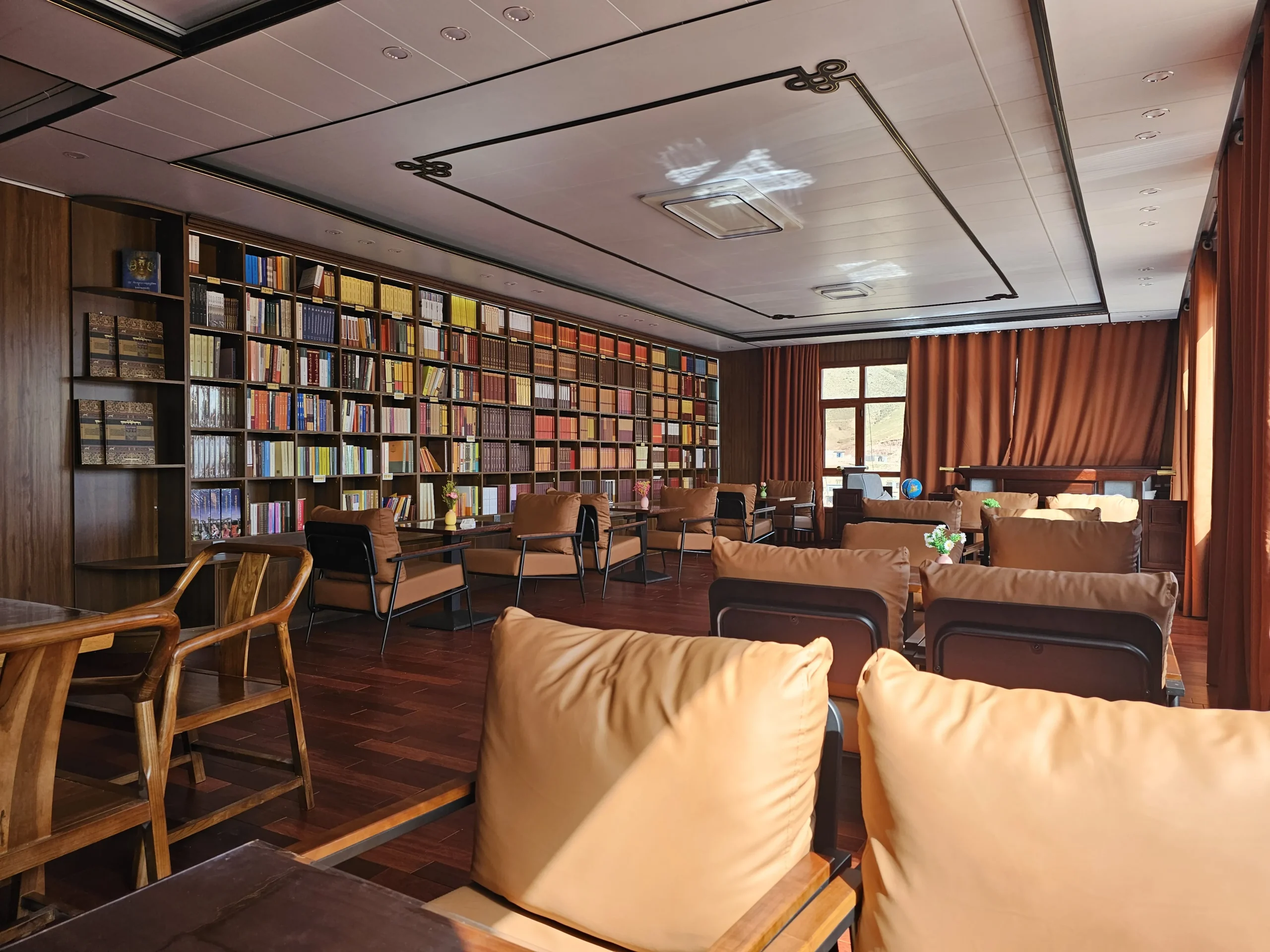 To support the life and practice of its monastic community, a dedicated residential complex was constructed on the western side of the monastery. This facility comprises 48 rooms across three stories, complete with bathrooms, laundry space, and a spacious dining hall connected to a commercial kitchen capable of serving over 500 meals. These provisions ensure the monastery can host large prayer ceremonies, welcoming monks from surrounding regions along with lay devotees who gather for practice and offerings. Behind the main temple, a standalone library and a modest non-profit general store were also established. The growing library, in particular, serves as a treasury of Dharma knowledge, supporting both resident monks and visiting practitioners in their studies.